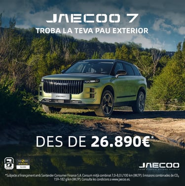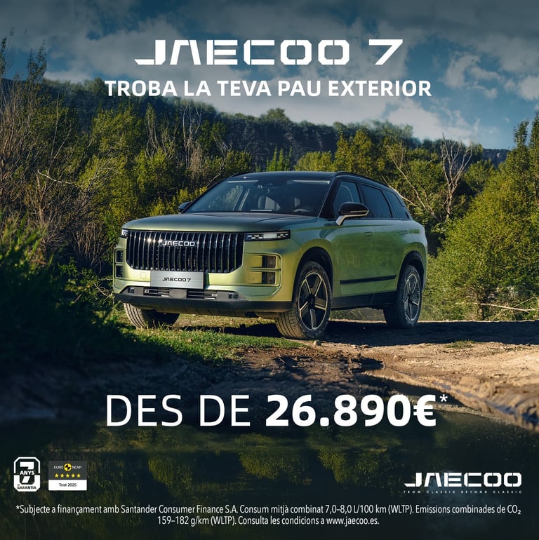 *PVP recomanat a Península i Balears per a Jaecoo 7 Select MY25 4×2 1.6TDGI 108kW (145cv) (IVA, impostos de matriculació, transport, descompte de marca i concessionari, descompte per permuta, descompte per finançar amb Santander Consumer Finance SA, inclosos a l'oferta). Sistema d'amortització francès. Oferta vàlida per a clients particulars que financin a través de Santander Consumer Finance, S.A. subjecta a estudi i aprovació segons condicions actuals amb un capital mínim de 18.000€, i amb una durada i permanència mínima del finançament de 36 mesos. Campanya incompatible amb altres ofertes financeres. Oferta subjecta a matriculació fins el 31/10/2025, i segons disponibilitat d'estoc. Regal de 1r manteniment a la Xarxa Oficial de Serveis Postvenda Jaecoo (inclou les operacions d'inspecció, substitució de peces i reposició de fluids d'acord amb les operacions estàndards establertes al Pla de Serveis de Manteniment, en un termini màxim d'1 any o 15.000 km (el que passi primer) i 1r any d'assegurança a tot risc amb franquícia 150€ acudint a la nostra Xarxa Oficial de Serveis Posventa Jaecoo) a través de Mutua Madrileña. 159-182g/km (WLTP) Per a més informació consulta al teu Concessionari Oficial JAECOO ia www.jaecoo.es.