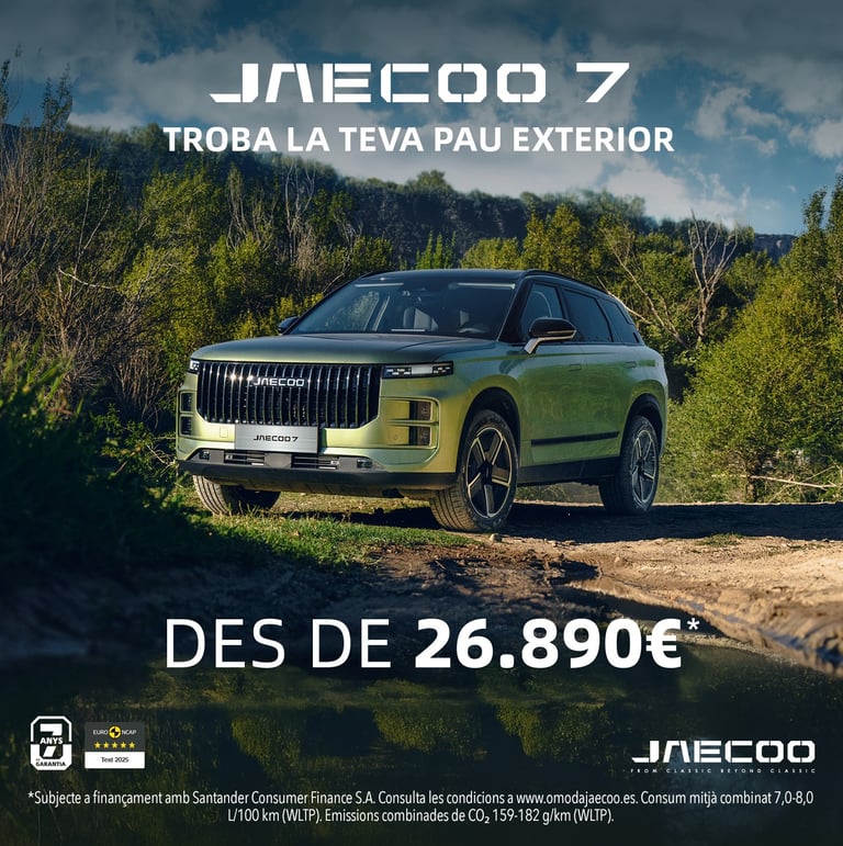 *PVP recomanat a la Península i Balears per al Jaecoo 7 Select MY25 4×2 1.6 TDGI 108 kW (145 CV) 7DCT (IVA, impost de matriculació, transport, descompte de marca i concessionari, descompte per permuta i descompte per finançar amb Santander Consumer Finance S.A., inclosos a l’oferta). Sistema d’amortització francès. Oferta vàlida per a clients particulars que financiïn a través de Santander Consumer Finance, S.A., subjecta a estudi i aprovació segons les condicions actuals, amb un capital mínim de 18.000 € i una durada i permanència mínima del finançament de 36 mesos. Campanya incompatible amb altres ofertes financeres. Oferta vàlida fins al 31/12/2025 i subjecta a disponibilitat d’estoc. Regal del primer manteniment a la Xarxa Oficial de Serveis Postvenda Jaecoo (inclou les operacions d’inspecció, substitució de peces i reposició de fluids segons les operacions estàndard establertes en el Pla de Serveis de Manteniment, en un termini màxim d’1 any o 15.000 km —el que passi primer—) i primer any d’assegurança a tot risc amb franquícia de 300 € (franquícia reduïda a 150 € si s’acudeix a la nostra Xarxa Oficial de Serveis Postvenda Jaecoo) a través de Mutua Madrileña. Garantia comercial de 7 anys o 150.000 km (el que passi primer), segons el Manual de Garanties. No inclou les despeses de matriculació i preentrega. Consum mitjà combinat 7,0–8,0 L/100 km (WLTP). Emissions combinades de CO₂: 159–182 g/km (WLTP). Per a més informació, consulta el teu Concessionari Oficial JAECOO.